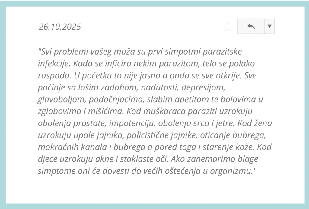 Kada smo stigli u bolnicu, lekar nam je saopštio groznu dijagnozu - parazitska infekcija . Skoro 70% tela mog muža je bilo okupirano parazitima. Nisam u potpunosti mogla razumeti razlog za to jer je muž uvek čist, ima dezinfekcijski papir a hrana se kuha pažljivo i uvek je čista. Nisam mogla zamisliti da su ovi blagi simptomi znak parazitske infekcije.